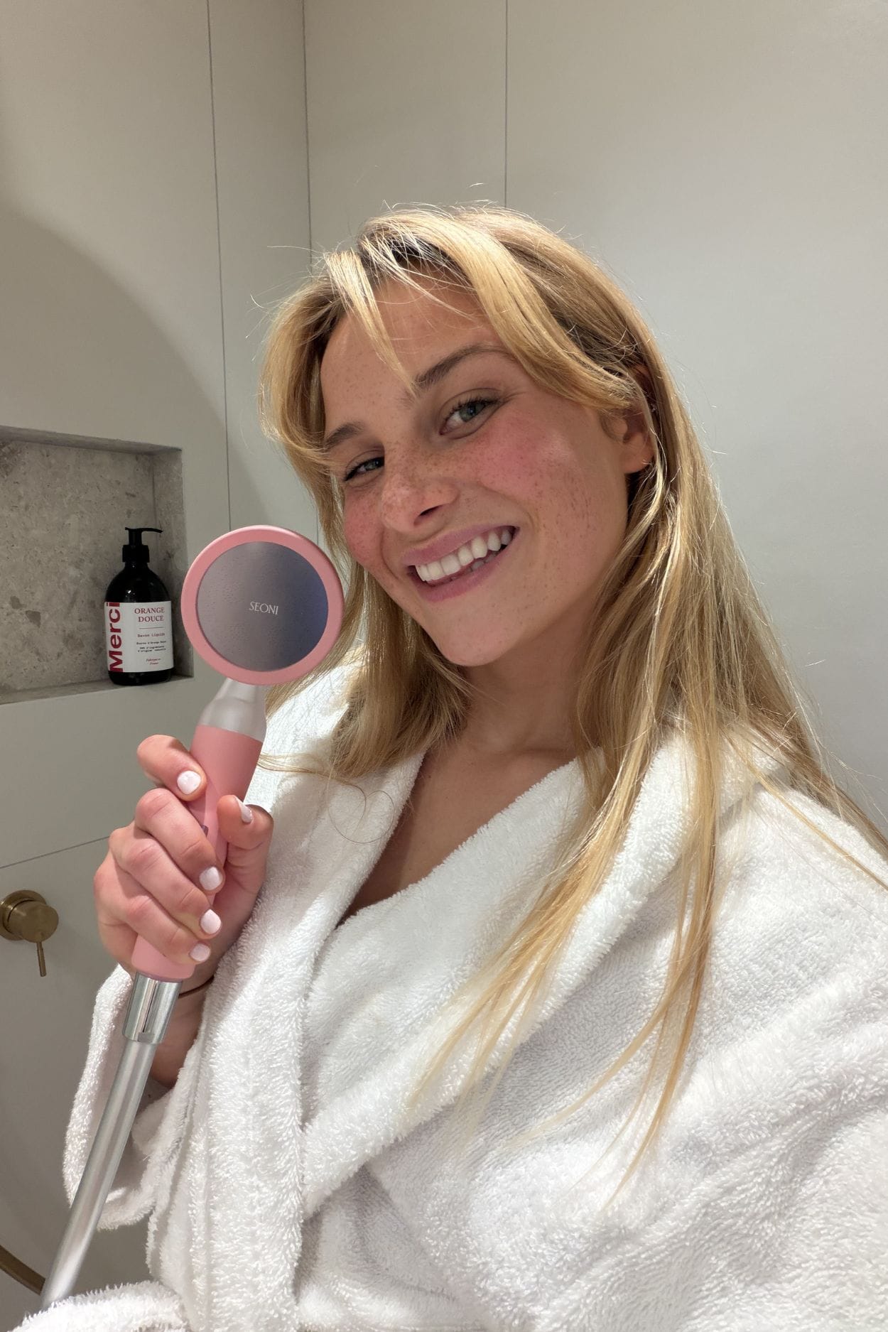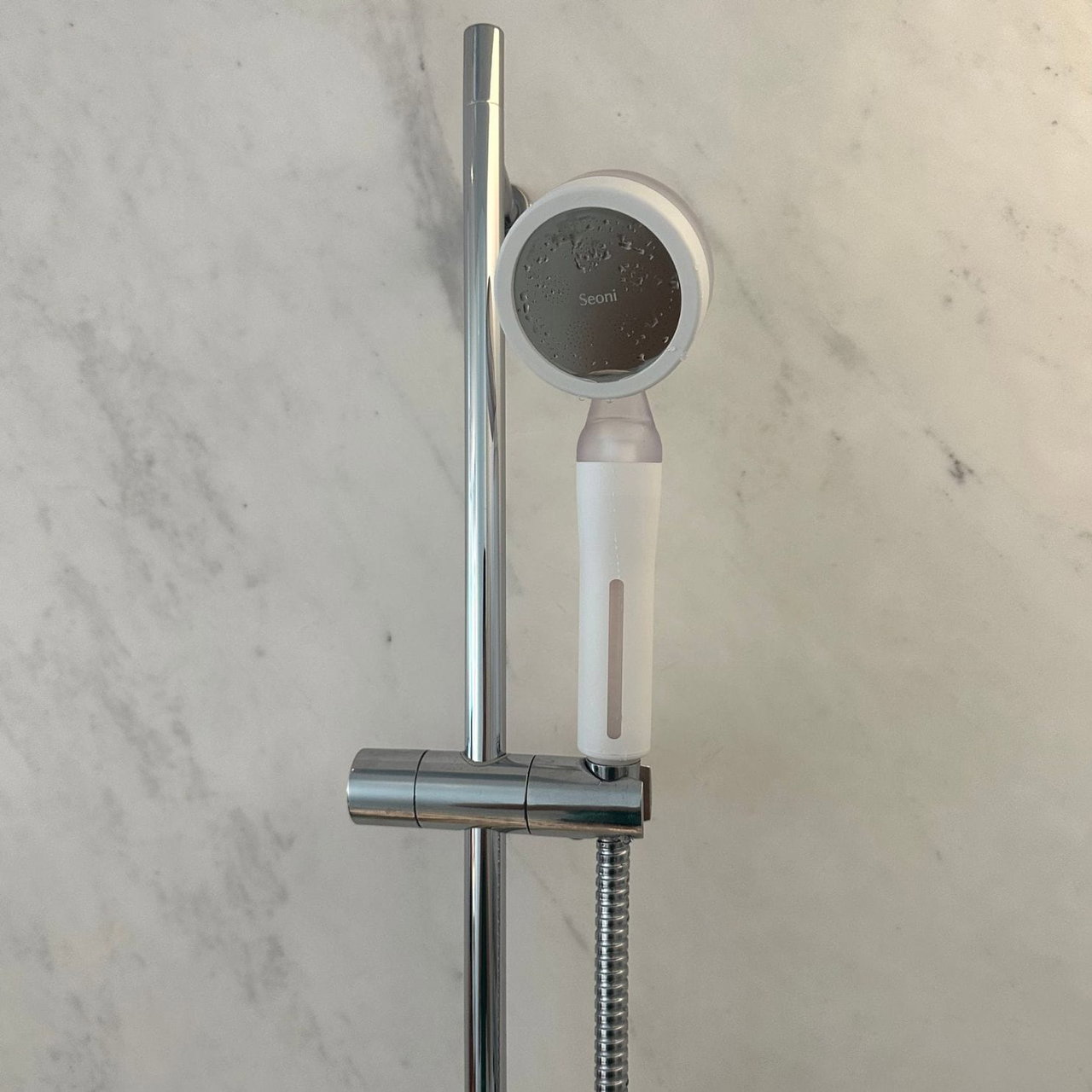 Grâce à sa technologie de micro-perforation, Seoni ne réduit pas la pression — il l'améliore. Une sensation douce et enveloppante, à chaque douche.