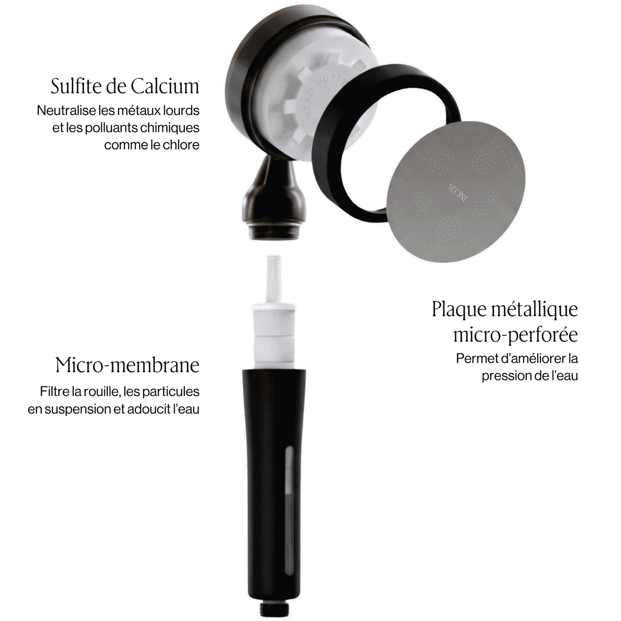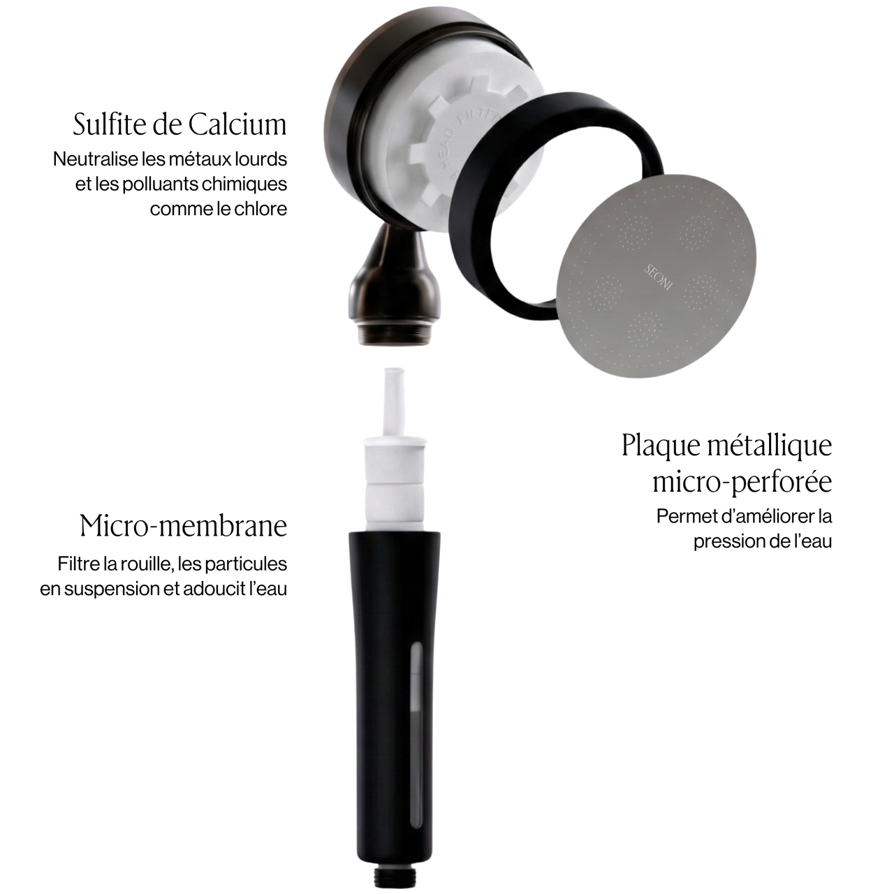 Les pommeaux Seoni sont équipés d'un système de double filtration testé en laboratoire et certifié par la World Atopy Association, un organisme coréen reconnu, spécialisé dans les pathologies cutanés.